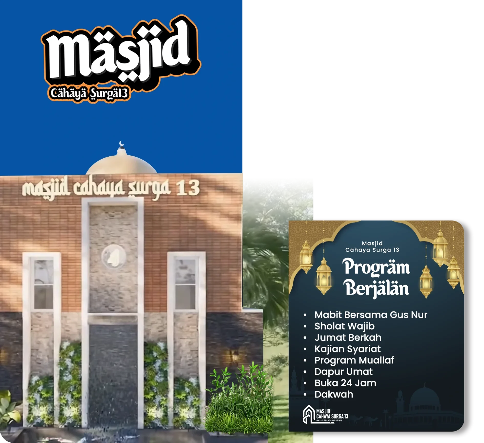 Satu-satunya Cluster dengan Masjid Visioner dengan prospek sebagai tempat kunjungan Religi hingga Pondok Pesantren di Malang. Masjid Cahaya Surga 13 berada dilingkungan Cluster yang kini telah beroperasi dengan beriringan proses finishing 100%. Masjid ini juga dibuka secara penuh 24 jam dengan jamaah hadir dari berbagai latar belakang sosial. Masjid Peradaban Islam adalah slogan utama dan telah dikenal luas di Malang. Kualitas adalah Prioritas!